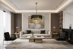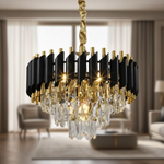 Les cylindres noirs agissent comme un écrin qui fait ressortir l'éclat de l'or. Ils apportent une structure géométrique moderne qui permet au lustre de s'intégrer aussi bien dans un manoir classique que dans un penthouse ultra-moderne.