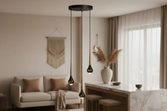Avec ses trois gouttes délicates suspendues à des hauteurs différentes, ce luminaire habille le vide de votre hall d'entrée. Sa finition bicolore noir et or agit comme un bijou précieux qui capte l’œil dès la porte franchie.