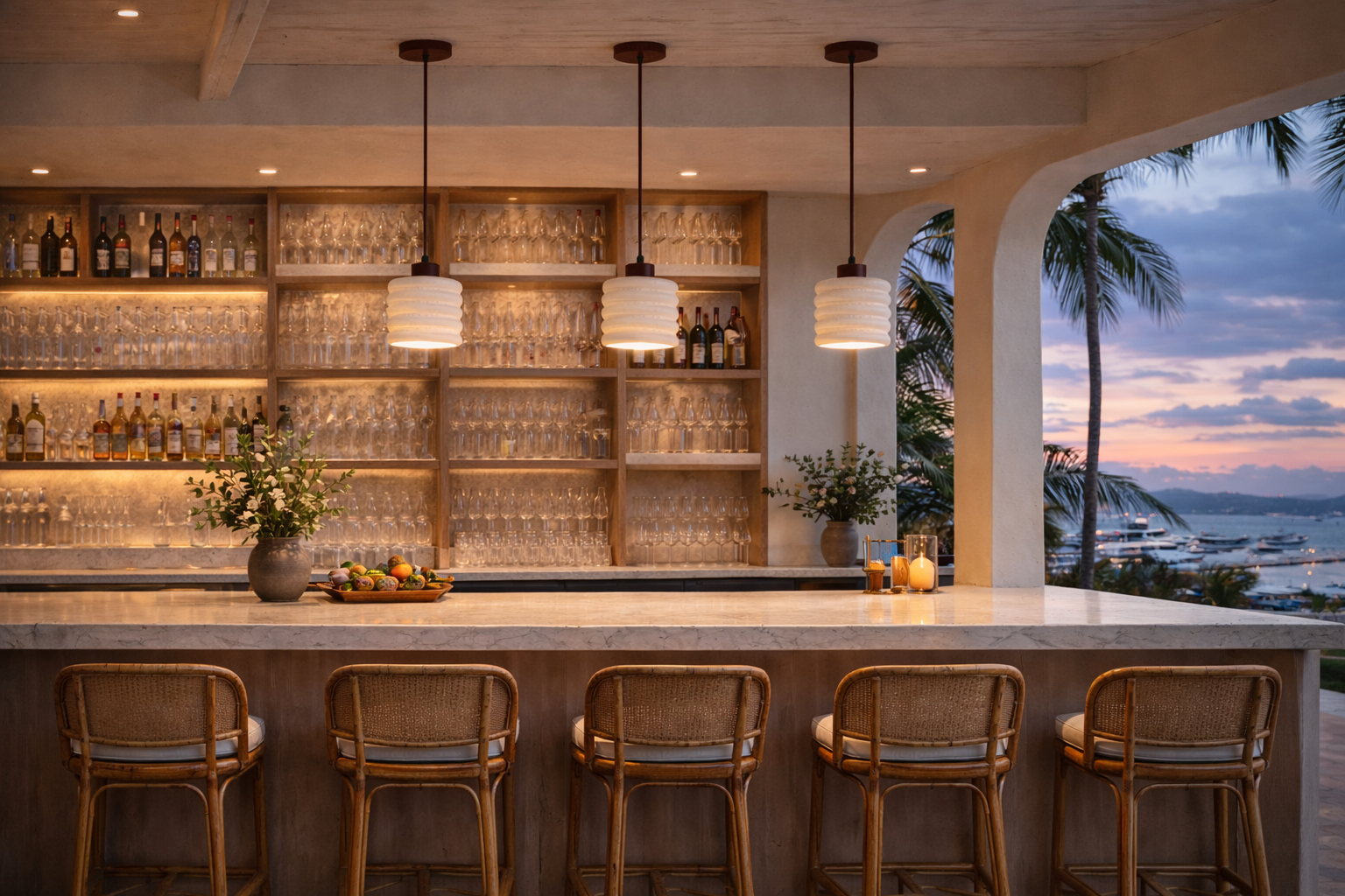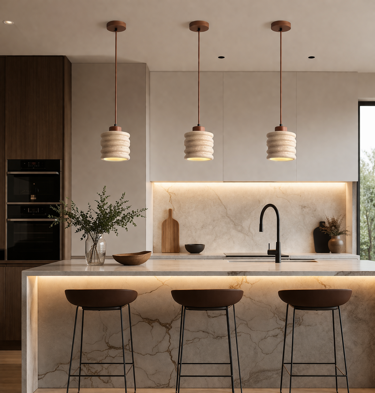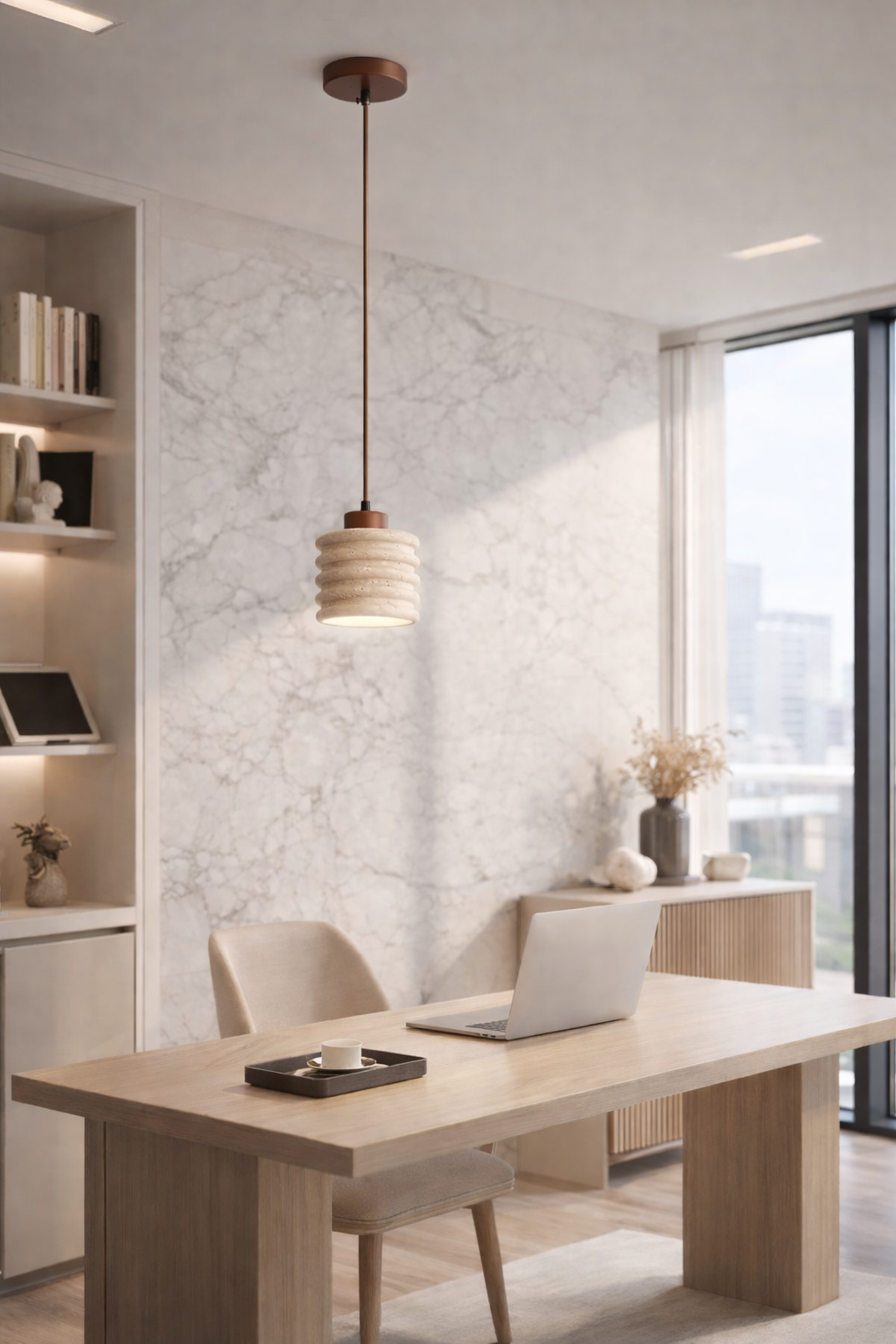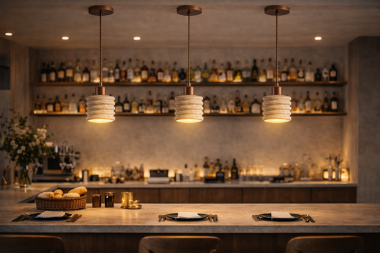 Installées en duo ou trio au-dessus d'un comptoir, ces suspensions naturelles créent un rythme visuel puissant. La texture rainurée de la pierre accroche la lumière de façon identique mais subtilement différente sur chaque pièce. La pierre naturelle adoucit la perception de la lumière. Le flux est dirigé précisément sur le comptoir, tout en baignant le bar dans une aura feutrée qui invite à la confidence lors de l'apéro.