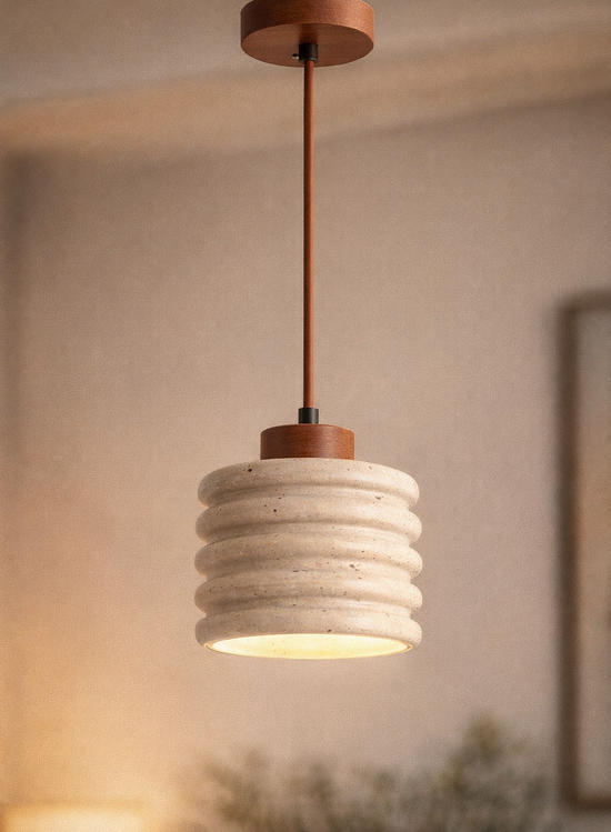 Redécouvrez le charme des matières naturelles. Notre luminaire est une pièce de caractère sculptée dans une matière texturée, elle rappelle le travertin ou la pierre volcanique. Son design annelé et son sommet en bois chaud créent un contraste organique irrésistible.